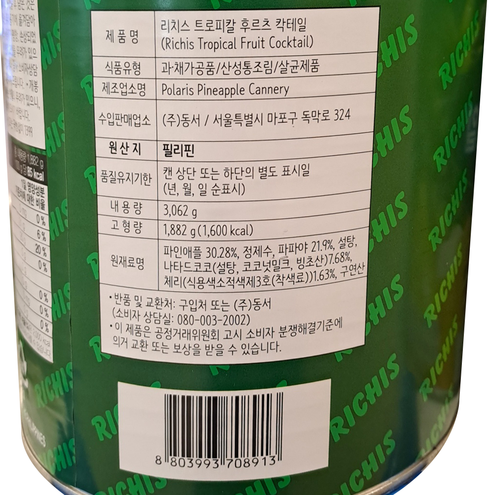 | 제품명 | 리치스 후르츠칵테일 3.062kg/동서 |