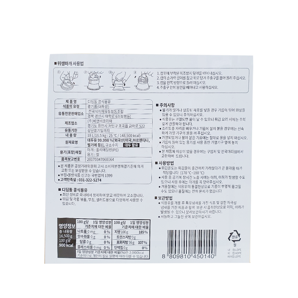 | 원재료명 및 함량(농수산물의 원산지 표시에 관한 법률에 따른 원산지 표시 포함) | 대두유 99.998% (외국산 : 미국, 아르헨티나, 벨기에등) |