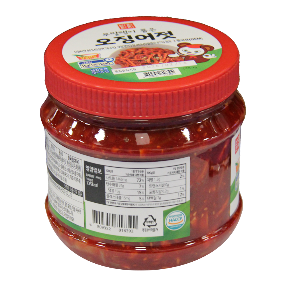 | 원재료명 및 함량(농수산물의 원산지 표시에 관한 법률에 따른 원산지 표시 포함) | 오징어젓 55% (오징어 70.5%, 정제소금 8%, 물엿, 고추가루, 마늘, 조미분등, 무말랭이무침 45% (무말랭이 67%등) |