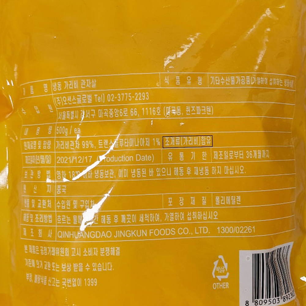 | 품목 또는 명칭 | 냉동 가리비관자살 500g/중국산(오션스G) |