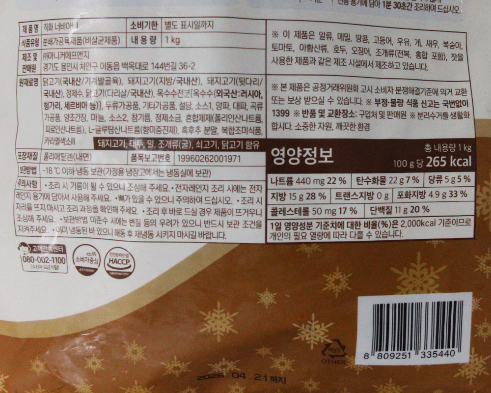 | 원재료명 및 함량(농수산물의 원산지 표시에 관한 법률에 따른 원산지 표시 포함) | 닭고기 26.91%(국내산,기계발골육), 돼지고기 17.12%(지방,국내산), 돼지고기 9.78%(뒷다리,국내산), 정제수, 닭고기 7.34%(다리살,국내산) |