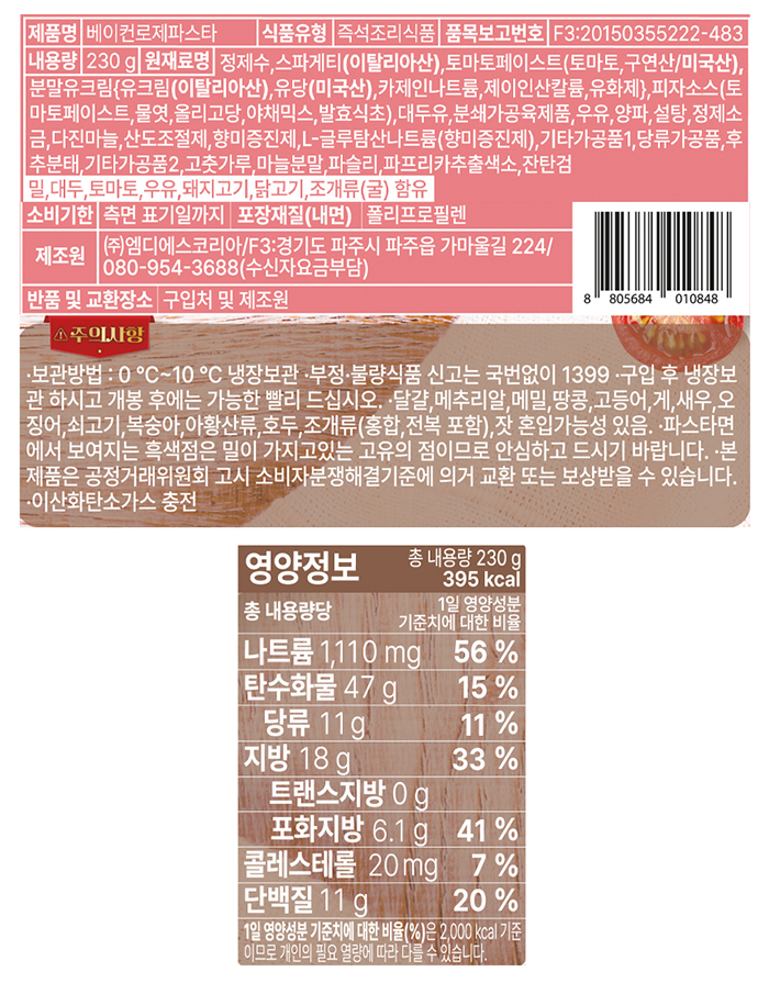 | 원재료명 및 함량(농수산물의 원산지 표시에 관한 법률에 따른 원산지 표시 포함) | 정제수,스파게티(이탈리아산),토마토페이스트(토마토,구연산/미국산),분말유크림{유크림(이탈리아산),유당(미국산),카제인나트륨,제이인산칼륨,유화제},피자소스(토마토페이스트,물엿,올리고당,야채믹스,발효식초),대두유,분쇄가공육제품,우유,양파,설탕,정제소금,다진마늘,산도조절제,향미증진제,L-글라탐산나트륨(향미증진제),기타가공품1,당류가공품,후추분태,기타가공품2,고춧...등 상세설명참조 |