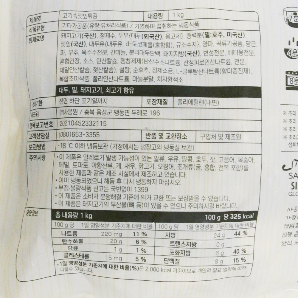 | 제품명 | 고기속깻잎튀김 1kg/사옹원 |