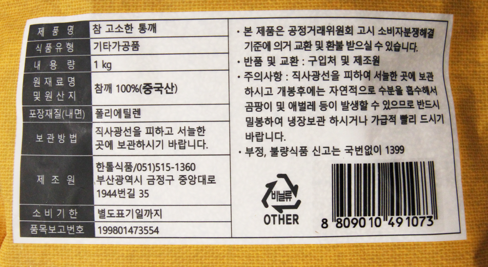 | 제품명 | 참고소한 통깨 1kg(중국산)/한톨식품 |