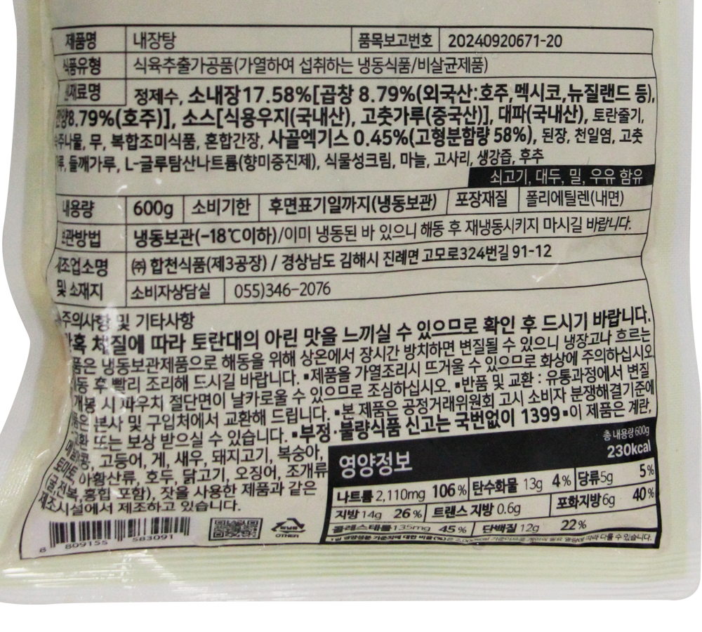 | 제품명 | 해든나라 내장탕 600g/합천식품 |
