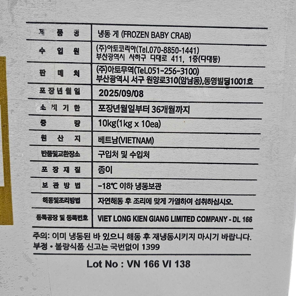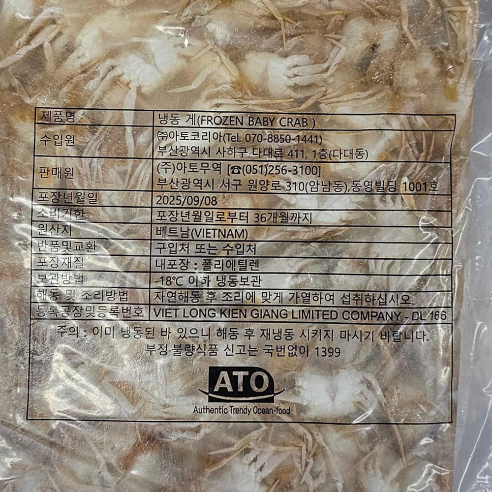 | 품목 또는 명칭 | 냉동 게(베이비크랩) 1kg/베트남산 |