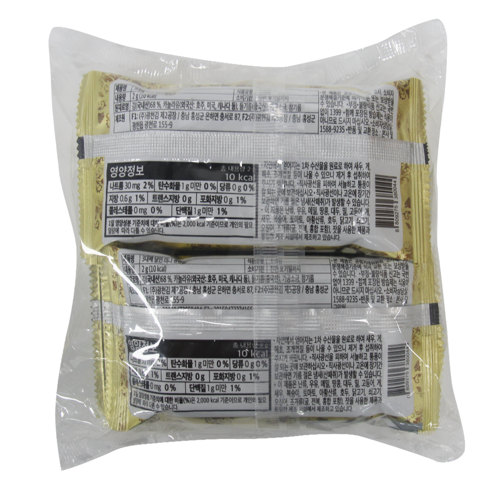 | 원재료명 및 함량(농수산물의 원산지 표시에 관한 법률에 따른 원산지 표시 포함) | 김(국내산)68%,카놀라유,들기름,가공소금,참기름 |