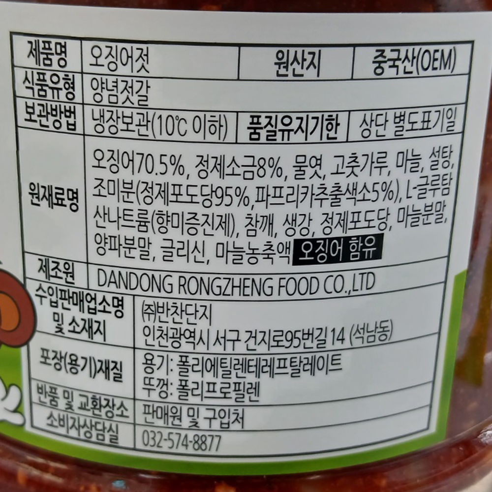 | 원재료명 및 함량(농수산물의 원산지 표시에 관한 법률에 따른 원산지 표시 포함) | 오징어 70.05%, 정제소금 8%, 물엿, 고추가루, 마늘, 설탕, 조미분등 |