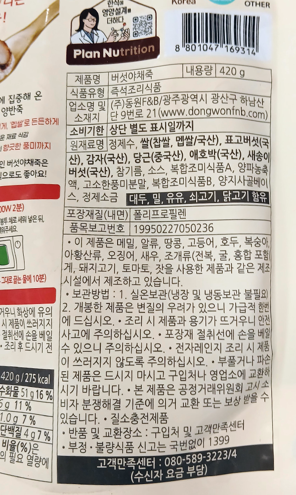 | 제품명 | 양반 버섯 야채죽(파우치) 420g /동원F&B |