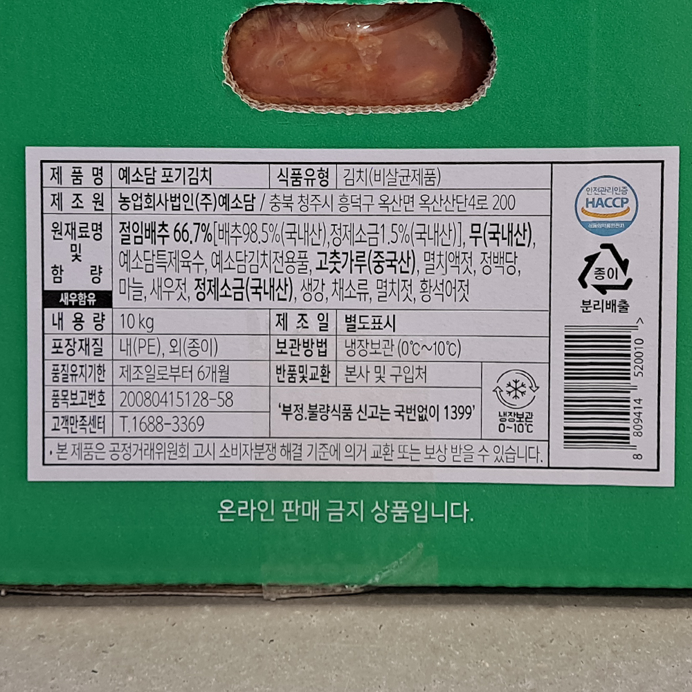 | 원재료명 및 함량(농수산물의 원산지 표시에 관한 법률에 따른 원산지 표시 포함) | 배추(국내산84.55%),무(국내산),고추가루,양파,대파,마늘,생강,부추,멸치액젓,재제염,정백당,멸치육수,밀가루풀,L-글루타민산나트륨(향미증진제) |