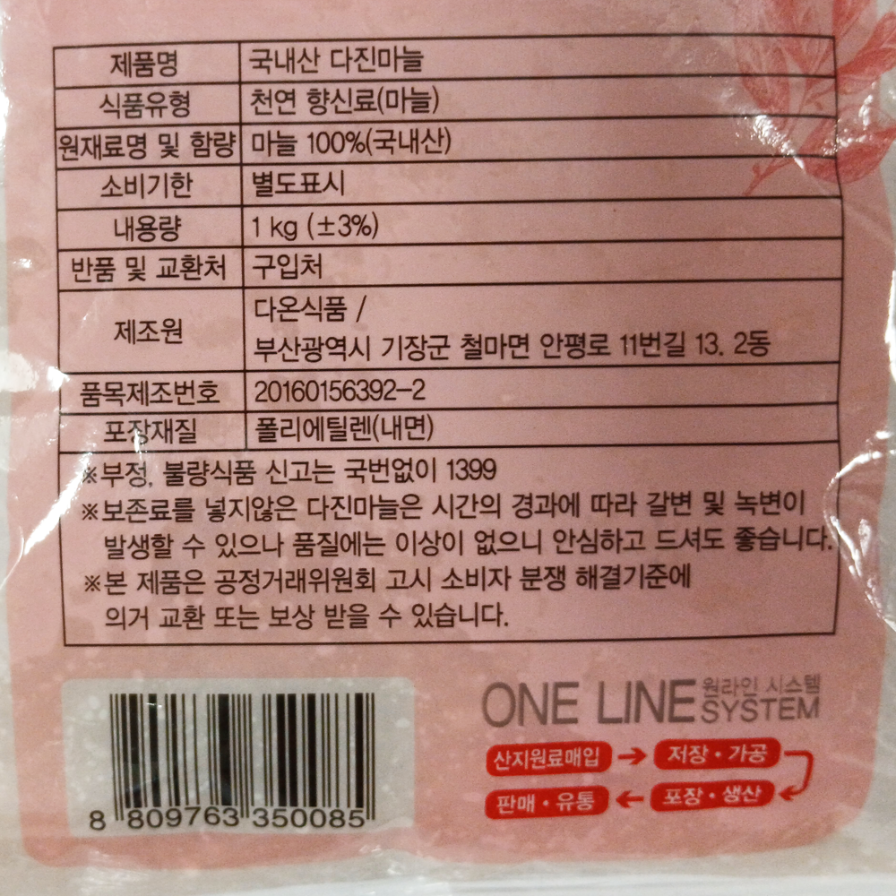 | 품목 또는 명칭 | 신선 다진마늘(국내산)·1kg/다온식품 |
